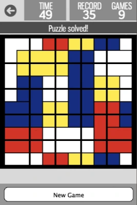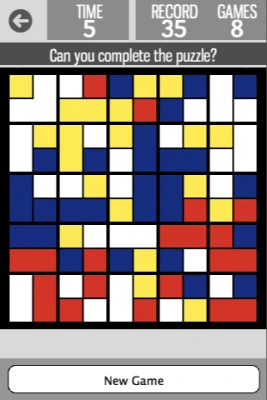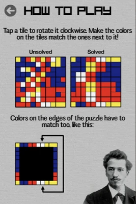 A minimalist Mondrian-inspired puzzle game. Spin the tiles by tapping them, until the colors in the corners of each tile match their neighboring colors. Colors need to match across the borders of the puzzle too - make sure the top matches the bottom, left edge matches the right edge!