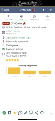 - Submission of individual difficulty ratings with graphical display of the difficulty distribution per boulder