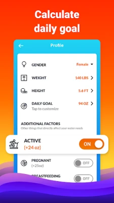 How much h2o to drink? Check it out! Our water tracker calculates your personal drinking goal considering weight, gender, activity, pregnancy, or breastfeeding. Plus, this water app can even check your weather conditions. Use this drinking water reminder app and keep dehydration at bay.