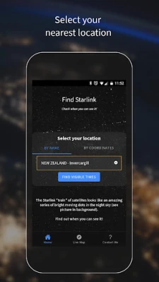Designed to be simple and easy to use. First, please select your nearest city (or coordinates), and click on 'Find Visible Times'. The app will list the times when you can see Starlink. You can also click 'Remind me' next to any timing, to get a reminder 30 minutes before Starlink will be visible at your location. A 'Live Map' lets you track where Starlink is currently in the world.
