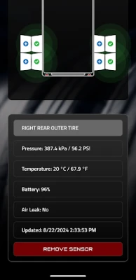 Users can pair Bluetooth Tire Pressure Monitoring System (TPMS) sensors with their trailer tires to monitor pressure and temperature in real-time. The app sends alerts for low pressure or high temperature, helping prevent potential issues before they become serious problems.